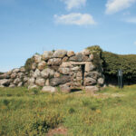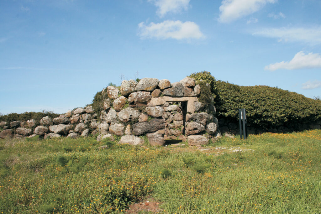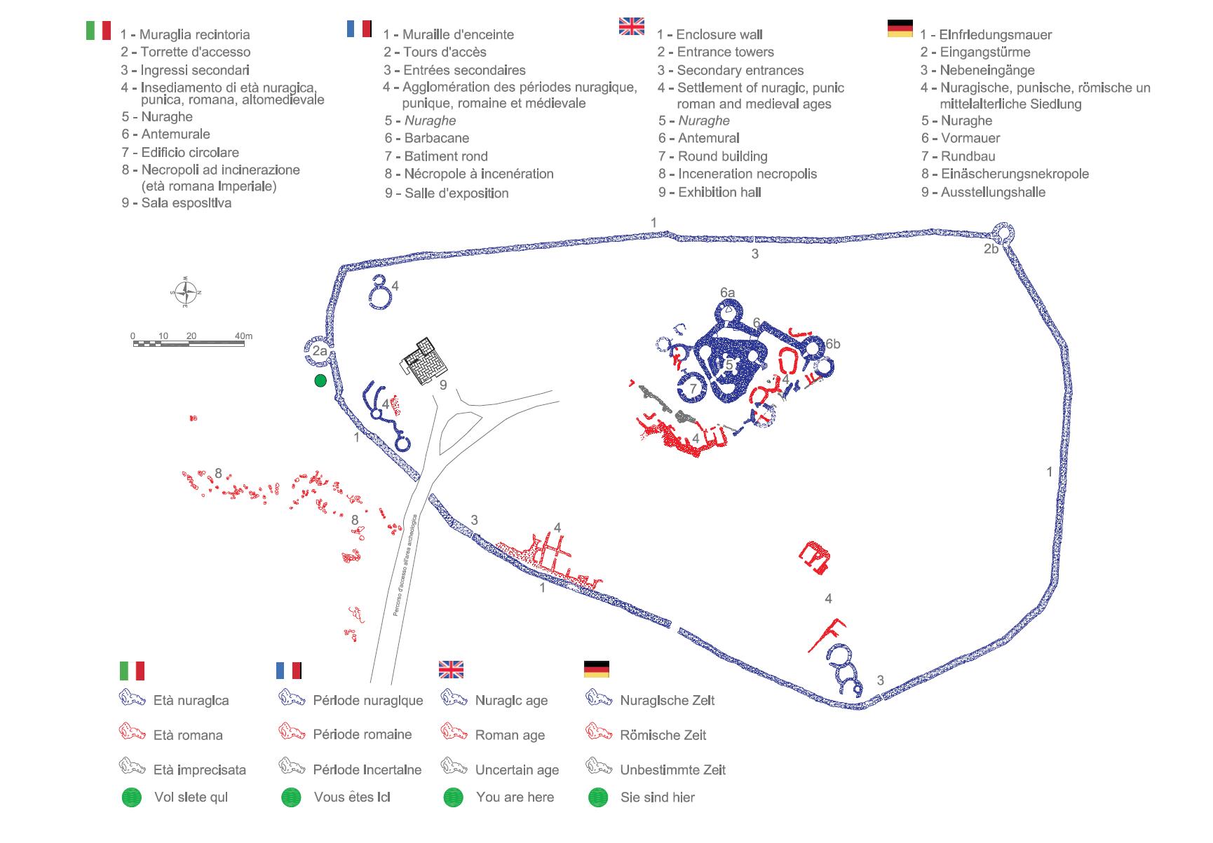 La muraglia recintoria ha forma all’incirca ellissoidale e misura circa m 270 di lunghezza sull’asse Nord-Sud e m 170 di larghezza massima sull’asse Est-Ovest. Si accedeva all’insediamento attraverso due torri-porte rotonde, sporgenti all’esterno dai vertici Sud e Nord-ovest della muraglia. Le torri-porte, restaurate negli anni ‘70, hanno all’interno una cameretta circolare con due ingressi diametralmente opposti. Inoltre lungo la muraglia si aprono alcuni varchi interpretati come accessi secondari.