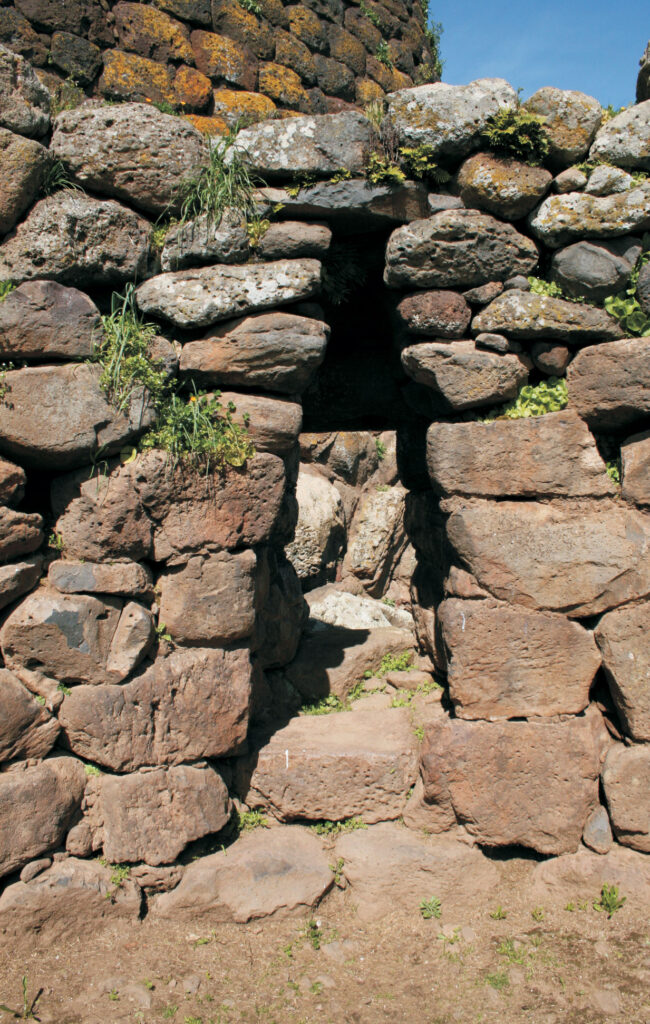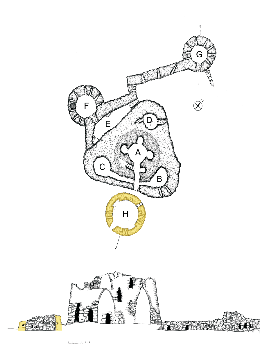 Davanti all’ingresso del nuraghe, a circa un metro di distanza, c’è un grosso edificio circolare (H) con diametro esterno di circa 9 metri, che racchiude un vano, anch’esso circolare, con diametro di circa 6 metri. Ha due ingressi affrontati, quello principale a Sud e l’altro a Nord. Il primo, rivolto verso l’insediamento e verso l’esterno, è ampio ed alto; invece il secondo è stretto e basso e forse era un passaggio di servizio collegato con l’ingresso del nuraghe. Al centro delle due pareti interne si trovano due nicchie larghe ma poco profonde, ciascuna delle quali ha, agli spigoli interni, due stipetti a circa m 1,40 d’altezza dal pavimento. Sulle pareti del vano interno si aprono anche alcune nicchiette e feritoie per illuminazione o difesa. Il diametro esterno e le feritoie avvicinano questo edificio alle due torri dell’antemurale posteriore; inoltre alcuni blocchi sporgenti ai due lati esterni suggeriscono che esso dovesse essere collegato proprio con l’antemurale.